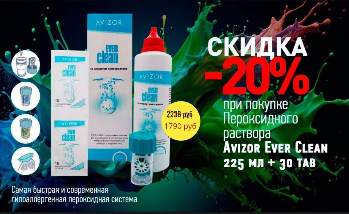 Скидка 20% при покупке пероксидного раствора Avizor Ever Clean 225 мл + 30 tab
