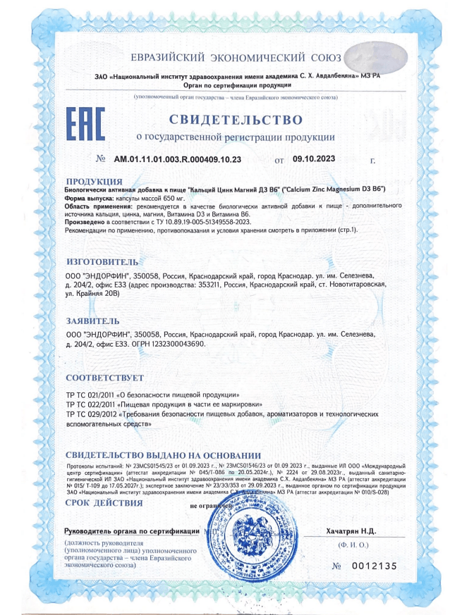 Биологически активная добавка к пище Кальций Цинк Магний Д3 B6 120 капсул